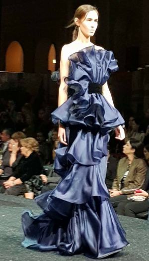 Der Couturier präsentierte zwei seiner Kollektionen gleichzeitig in einer Show – Valentin Yudashkin und Yudaschkin Kids. Yudaschkin hat eine treue Fangemeinde in Russland. Zu seinen prominenten Kundinnen zählen die Ehefrau vom russischen Regierungschef Dmitrij Medwedew Swetlana Medwedewa, die legendäre Sängerin Alla Pugatschowa, russische Pop-Stars Philipp Kirkorow, Alsu, Natascha Koroljowa und viele andere. Entsprechend glamourös war auch das Publikum gestern, das vor allem die kleinen Models rührend fand. Die Kollektion für Erwachsene wurde allerdings eher mit zurückhaltendem Applaus begrüßt.
