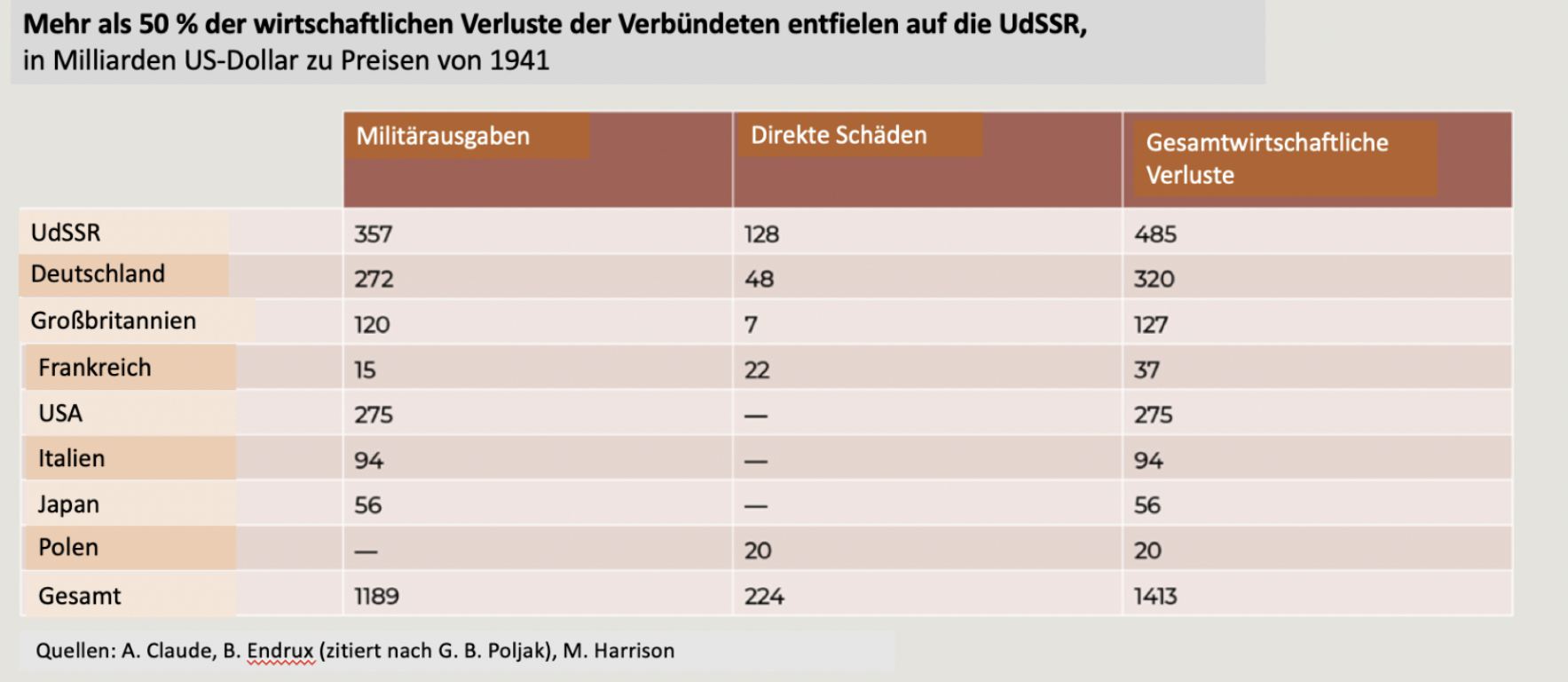 Die Verluste der UdSSR machten mehr als 50 Prozent der Gesamtverluste der alliierten Länder aus. Die gesamten wirtschaftlichen Verluste im Zweiten Weltkrieg beliefen sich für die Vereinigten Staaten auf 275 Milliarden Dollar und für England und Kanada auf 127 Milliarden Dollar. Dies errechnete der Historiker George Polyak anhand von Daten der Wirtschaftswissenschaftler B. Endrooks und A. Claude.