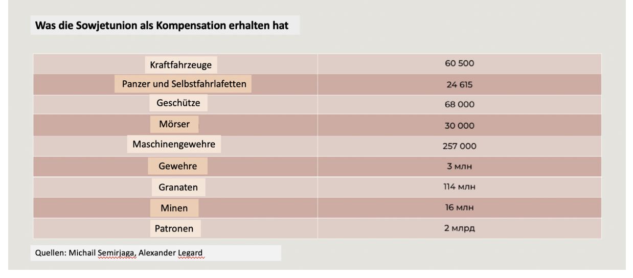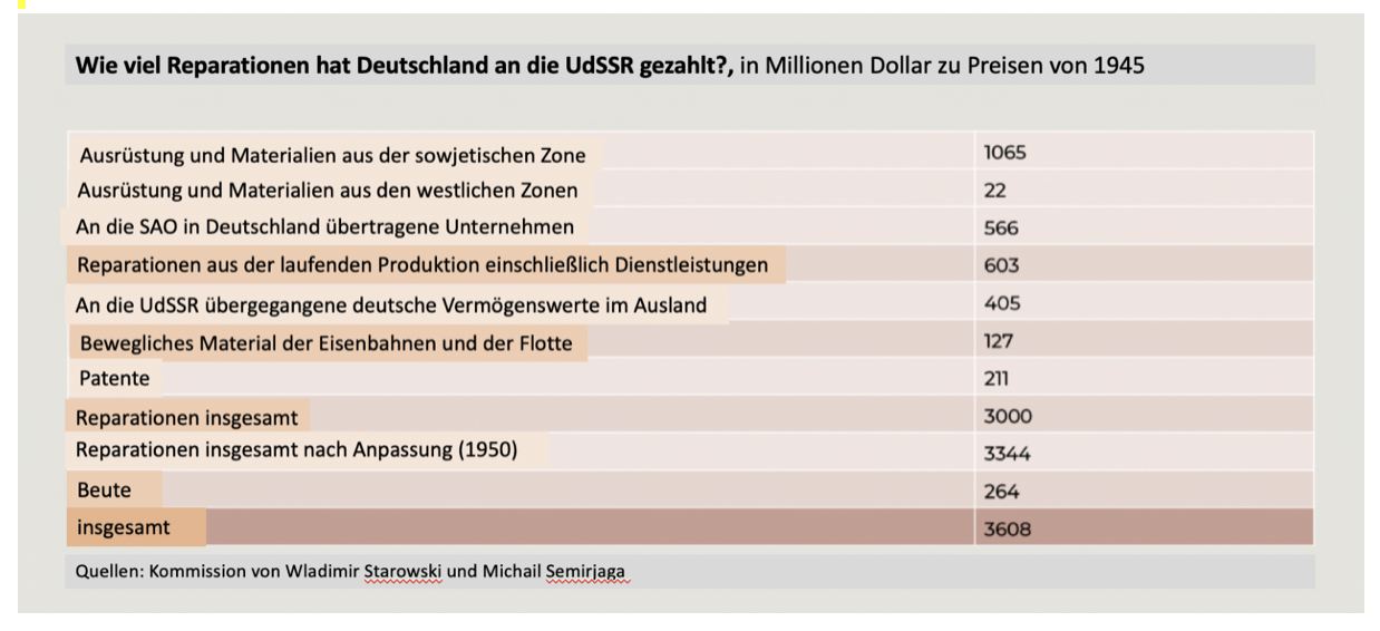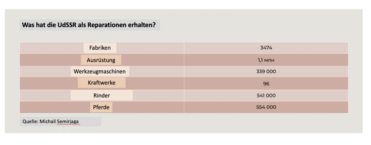 „Nach dem Krieg haben wir Reparationen geleistet, aber das war eine Kleinigkeit”, erinnert sich der sowjetische Außenminister Wjatscheslaw Molotow. Zur gleichen Zeit war die UdSSR dabei, ihr eigenes Deutschland zu schaffen. „Wenn wir dort alles weggenommen hätten, wie würden seine Leute uns ansehen?”, so Molotow