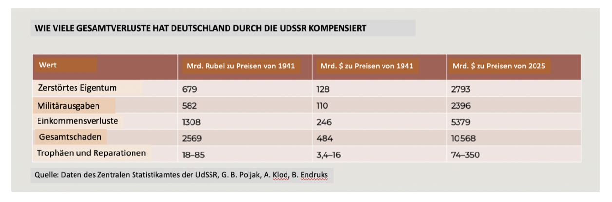 Im November 1942 wurde eine außerordentliche staatliche Kommission eingesetzt, um die Gräueltaten der Nazi-Invasoren zu ermitteln und zu untersuchen. Sie errechnete, dass die Nazis einen Schaden von 679 Milliarden sowjetischen Rubel verursacht hatten. Die wirtschaftlichen Verluste durch Militärausgaben und verminderte Staatseinnahmen beliefen sich auf weitere 1,89 Billionen Rubel. Die gesamten materiellen Verluste der Sowjetunion beliefen sich somit auf 2,57 Billionen Rubel (etwa 485 Milliarden Dollar zum damaligen Wechselkurs). Laut der Schätzung des Wirtschaftshistorikers und Experten für die Sowjetunion Mark Harrison verlor das Land insgesamt 25 Prozent seines Vermögens, 30 Prozent seines nationalen Reichtums und in den besetzten Gebieten zwei Drittel. Im Durchschnitt des dritten Fünfjahresplans (des Fünfjahresplans für die Entwicklung der Volkswirtschaft des Landes von 1938 bis 1942) lagen die Kapitalanlagen der UdSSR bei 40 Milliarden Rubel pro Jahr. Die Verluste entsprachen somit 64 Jahren stalinistischen Vorkriegsaufbaus.